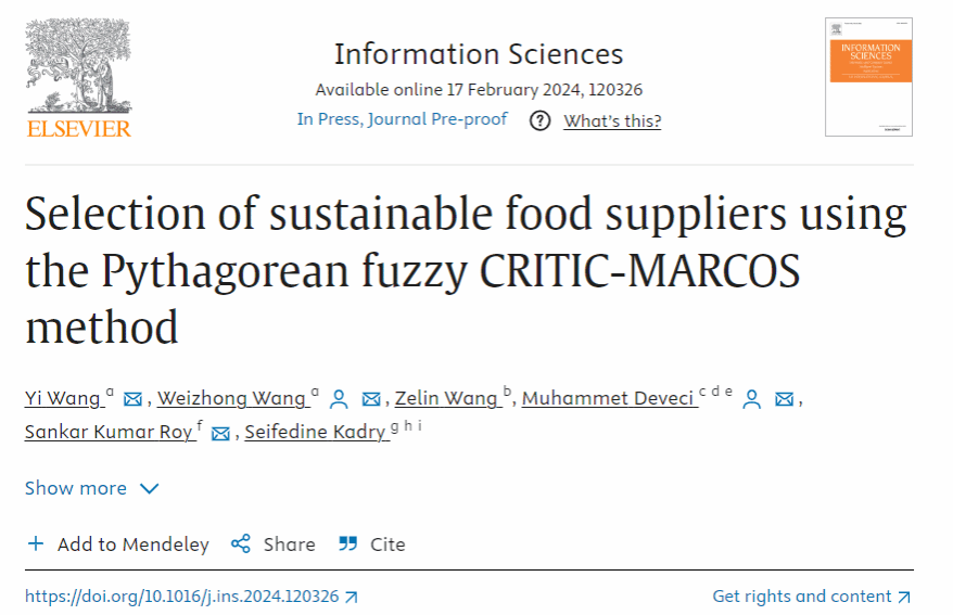 近日,公司汪伟忠副教授指导的2022级工商管理学硕士研究生王怡的论文“Selection of sustainable food suppliers using the Pythagorean fuzzy CRITIC-MARCOS method”在信息管理领域的国际权威期刊《Information Science》发表。论文第一作者为2022级硕士生王怡,通讯作者为汪伟忠副教授。《Information Science》是信息管理系统领域的国际顶级期刊,该杂志主要发表关于信息管理、数据科学、知识工程和智能系统筹领域的最新研究成果。该期刊是中科院一区,TOP期刊,CCF-B类期刊,是公司认定的顶级五类期刊,2023年的影响因子为8.1。据悉,这是m88官网工商管理学硕士研究生首次以第一作者在中科院一区TOP期刊发表论文。