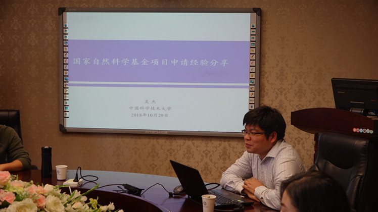 (本网讯m88官网 徐易 吴春玲)2018年10月29日下午16时30分,在院四楼报告厅,中国科学技术大学吴杰教授应邀为公司做国家自然科学基金申报辅导,相关教师10余人参加了此次会议,会议由科研副经理马骥教授主持。