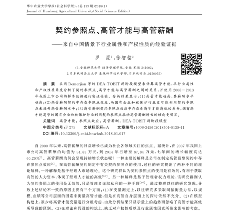 本网讯(m88官网 孙银玉 吴春玲)公司教师罗昆博士的论文《契约参照点、高管才能与高管薪酬——来自中国情景下行业属性和产权性质的经验证据》被《华中农业大学学报》(社会科学版)录用发表,发表在2018年01期。 契约参照点_高管才能与高管薪酬__省略_景下行业属性和产权性质的经验证据_罗昆_.pdf