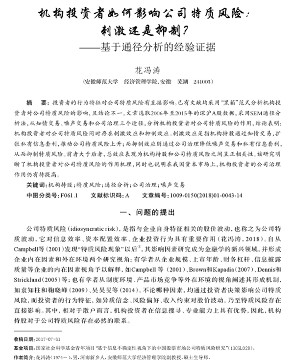 (本网讯 m88官网 吴春玲)公司教师花冯涛博士的又一篇C刊论文《机构投资者如何影响公司特质风险:刺激还是抑制?——基于通径分析的经验证据》被《上海财经大学学报》2018年01期录用发表 机构投资者如何影响公司特质风险__省略_还是抑制_基于通径分析的经验证据_花冯涛.pdf