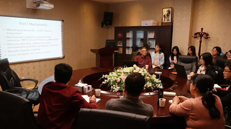 在报告过程中,王教授从五个方面进行论述,第一、二氧化碳背景资料介绍;第二、国际对二氧化碳排放回应;第三、国内二氧化碳排放情况;第四、全球变暖对发达国家和发展中国家影响;第五、碳排放产生的新学科:低碳经济。其中对于低碳经济热点问题王教授提出三点:排放配额、碳遗漏、ETS的表现,引得同学们深入思考。最后师生进行了热烈互动,王教授就论文发表方面指出,发表国际期刊要进行多次修正,同时,发表论文期刊要结合自身实力。最后张琼教授对王教授的观点表示赞同,并指出低碳经济对社会发展产生重要影响,对于美丽中国生态文明建设具有重要作用。
