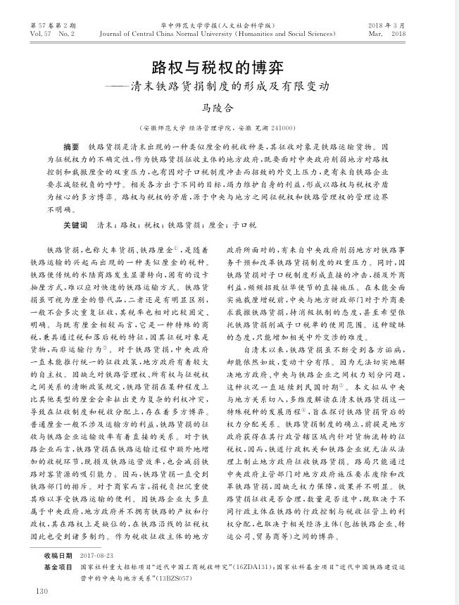 (本网讯 m88官网 朱守梅 吴春玲)公司教师马陵合教授的论文《路权与税权的博弈———清末铁路货捐制度的形成及有限变动》被C刊《华中师范大学学报(人文社会科学版》2018年01期录用发表。 路权与税权的博弈_清末铁路货捐制度的形成及有限变动_马陵合.pdf