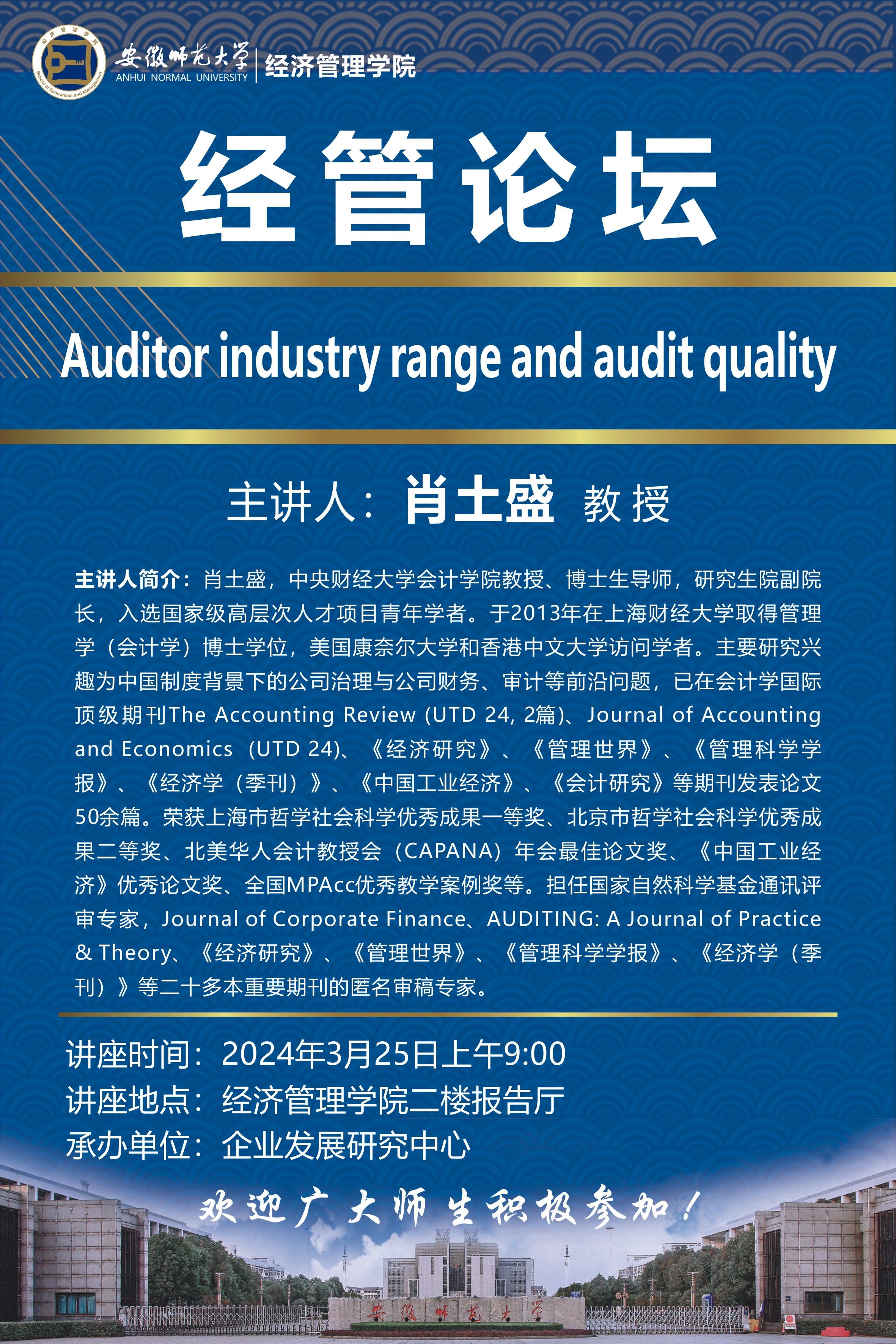 【学术讲座预告】肖土盛:Auditorindustry range and audit quality