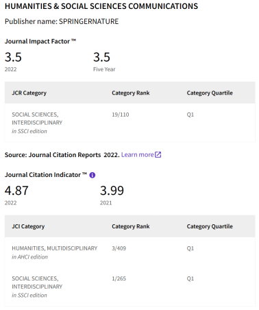 Humanities & Social Sciences Communications(HSSC《人文与社会科学通讯》)是Nature(《自然》)旗下唯一面向人文社会科学的子刊,致力于出版人文科学、社会与行为科学所有领域的高水平研究成果,该刊为Social Sciences Citation Index(社会科学引文索引,简称SSCI)和Arts & Humanities Citation Index(艺术与人文科学索引,简称A&CHI)共同索引,在JCR和JCI报告中的人文领域(Humanities)、社会科学(Social Science)领域分区排名均为Q1。HSSC期刊引用指数(Journal Citation Indicator)为4.83,在社会科学等多学科领域的265种期刊中排名第1,在全球人文社科领域具有重要影响力。