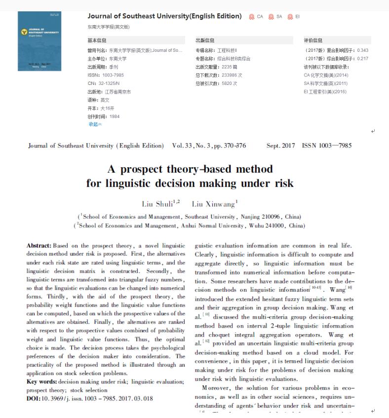 (本网讯 m88官网 吴春玲 )公司教师刘树利博士的论文《A prospect theory-based method for linguistic decision making under risk》被《东南大学学报》(英文版)发表在2017年33卷03期,并被EI收录。 A prospect theory-based method for linguistic decision making under risk_刘树利.pdf