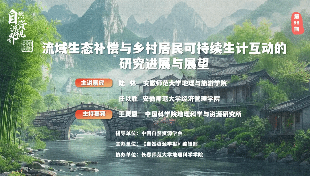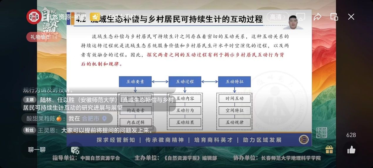 2024年6月27日晚,受《自然资源学报》编辑部邀请,m88官网任以胜副教授和地理与旅游公司陆林教授担任第96期“自然资源·视界”学术直播嘉宾并作报告,推广其团队在《自然资源学报》2024年第5期发表的学术成果《流域生态补偿与乡村居民可持续生计互动的研究进展与展望》及相关内容。本次线上直播报告由中科院地理资源所王灵恩副研究员主持,报告共吸引了近700位来自高等院校、科研机构的专家学者以及业内外人士通过线上直播方式观看。