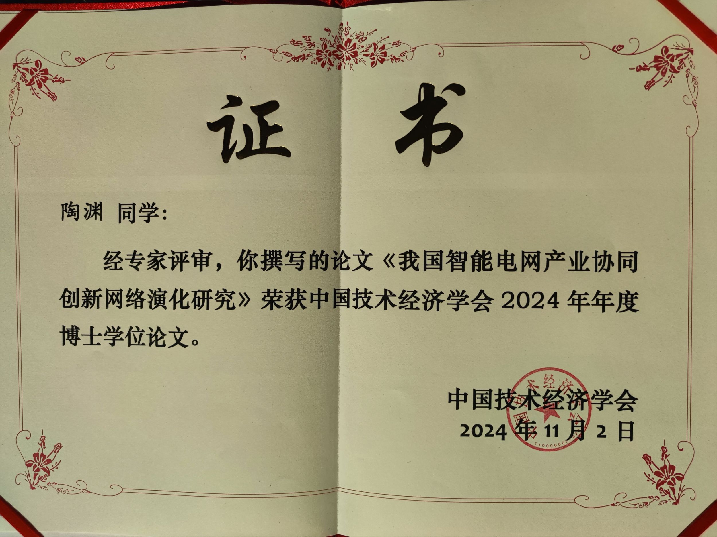 公司青年教师陶渊博士撰写的博士学位论文《我国智能电网产业协同创新网络演化研究》,经专家评审,荣获中国技术经济学会2024年年度博士学位论文荣誉证书。