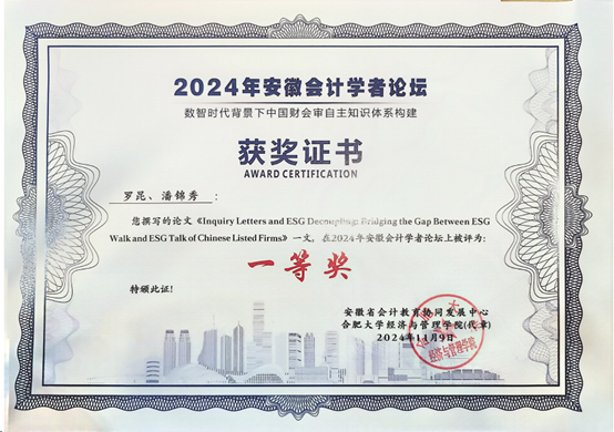合肥大学党委委员、副董事长白义香和淮北师范大学党委常委、副董事长、安徽会计教育协同发展中心主任委员翟胜宝出席开幕式并致辞。会议第一场,上海财经大学会计公司经理靳庆鲁教授、财政部会计名家张敦力教授、合肥工业大学蒋翠清教授和安徽大学周泽将教授4位会计领域资深学者,关于会计前沿话题和未来发展做了高质量论文汇报和学术交流。会议第二场共分为三个分论坛进行学术交流,2022级工商管理潘锦秀同学于第二分论坛顺利完成题为“Inquiry Letters and ESG Decoupling: Bridging the Gap Between ESG Walk and ESG Talk of Chinese Listed Firms”的论文汇报,获得了分论坛老师的肯定。