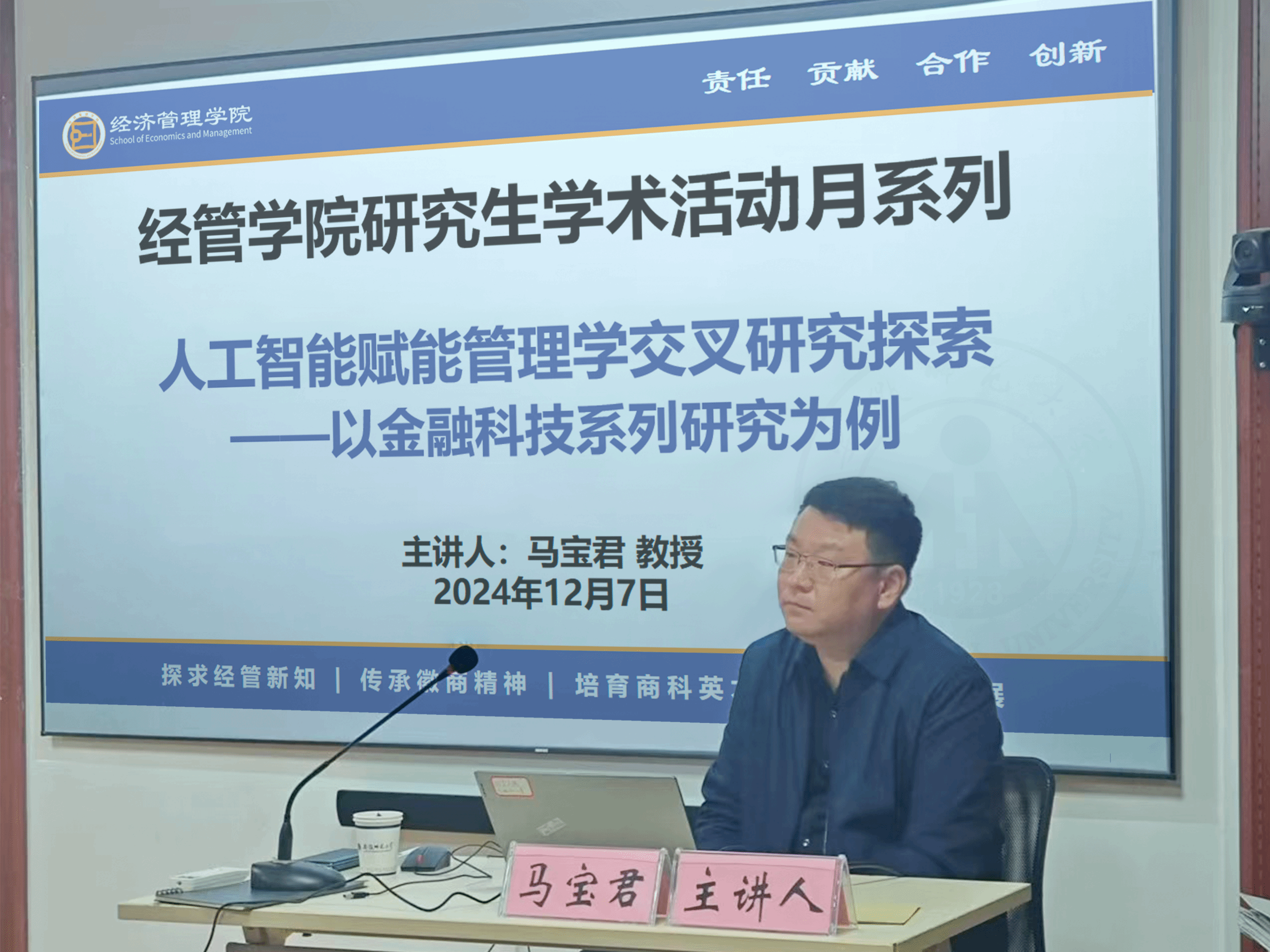 2024年12月7日上午,m88官网邀请教育部青年人才项目入选者、上海外国语大学马宝君教授举办了一场以“人工智能赋能管理学交叉研究探索:以金融科技系列研究为例”为主题的学术讲座,公司24级工商管理学和金融专业研究生共计50余人参加讲座,讲座由m88官网副经理伍旭中教授主持。