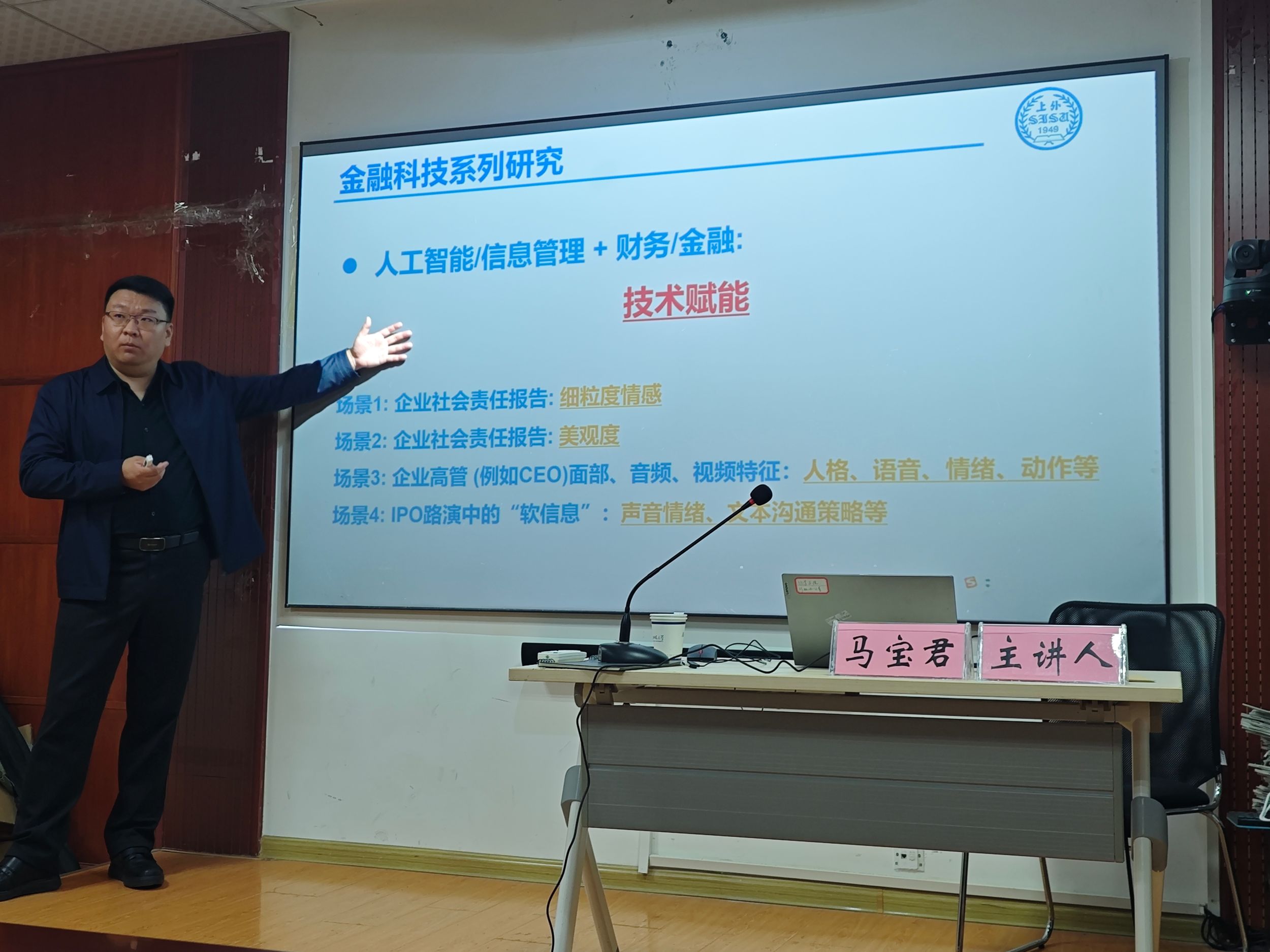 随后,马宝君教授分享了自己追逐科研理想的人生思考,阐述了个人的主要研究方向,介绍了自己在金融科技领域的研究经历和成果。他强调在金融科技研究领域,一场以人工智能管理为核心的学术交叉探索正掀起新的热潮,并指出人工智能管理成果有望在提升金融机构运营效率、促进金融市场稳定等多方面发挥重要作用,助力金融行业在人工智能时代实现转型升级与高质量发展,也为其他领域的学术交叉研究提供了成功范例与宝贵经验。