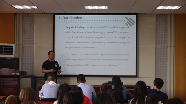 最后,杨教授报告了其团队为解释该研究命题所构造的分析框架和实证结果,为师生们认识该问题和解决该问题提供了有益的指导。杨教授的报告具有很强的理论性和前沿性,大量的背景分析和实证经验很有吸引力,讲座内容丰富充实。报告会结束后,杨教授又与大家进行了交流和讨论,使参会者对国内工业企业方面的环境规制问题有了更深一步的了解。