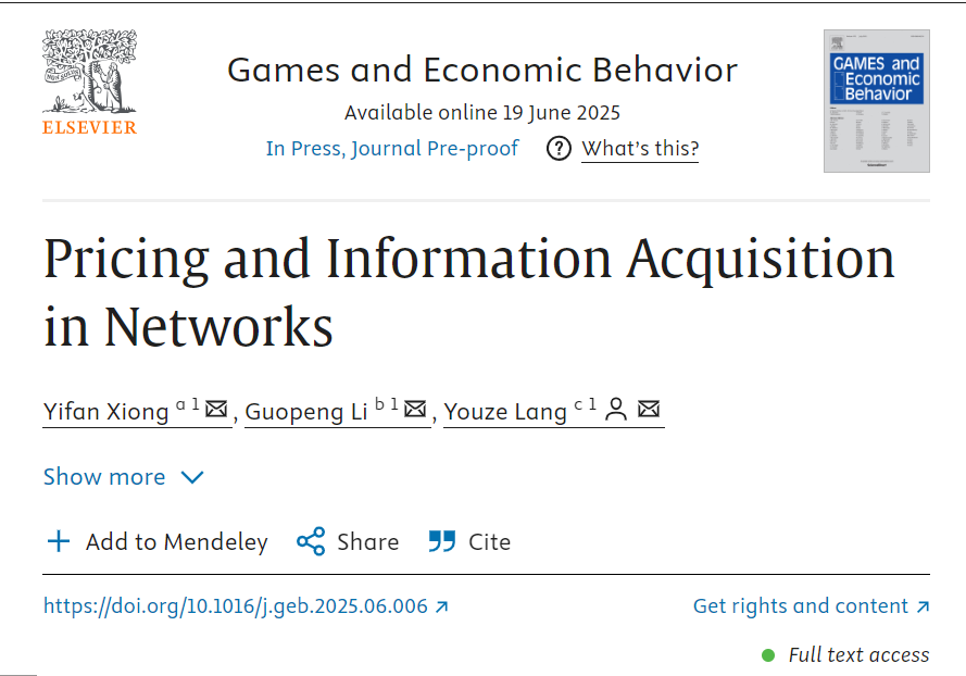 近日,m88官网教师熊一凡博士合作论文“Pricing and information acquisition in networks”在博弈论领域国际顶级期刊《Games and Economic Behavior》发表,m88官网为第一完成单位,根据Web of science数据库检索,本文是安徽省首次在该类国际顶级期刊发表,研究成果填补了我省在微观经济理论领域国际高水平期刊发表的空白,标志着公司在该领域研究中取得的历史性突破。