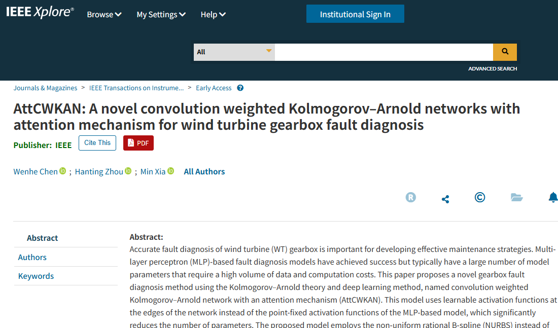 “AttCWKAN: A novel convolution weighted Kolmogorov–Arnold networks with attention mechanism for wind turbine gearbox fault diagnosis”一文2025年7月15日在线发表于期刊IEEE旗下Trans系列的IEEE Transactions on Instrumentation and Measurement(m88官方网站登录地址电子科学与技术大类A5期刊)。
