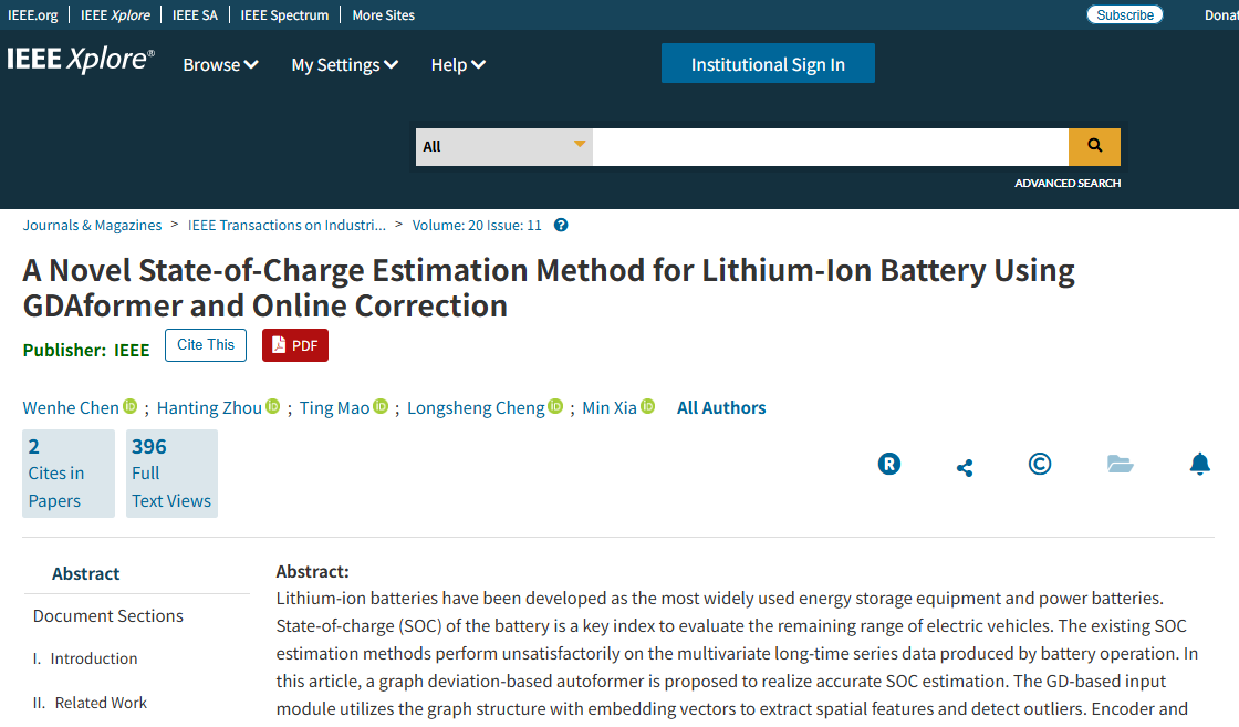 “A Novel State-of-Charge Estimation Method for Lithium-Ion Battery using GDAformer and Online Correction Prediction of Regional Wind Power Generation”一文2024年8月13日在线发表于IEEE旗下顶级期刊IEEE Transactions on Industrial Informatics(m88官方网站登录地址智能、通信与控制大类A5期刊)。