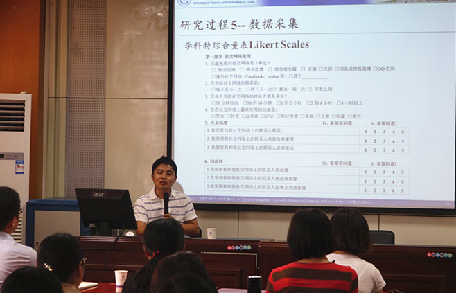 (本网讯 朱守梅 吴春玲)6月13日全天,在经管公司二楼报告厅,中国科技大学刘和福教授应邀作了题为“实证研究的范式和要求”的学术报告,相关教师和研究生及部分本科生参与了聆听,报告会由科研副经理马骥主持。