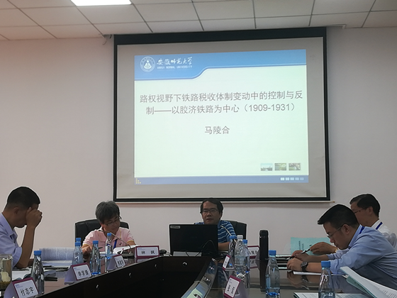 马陵合教授在主题发言中解读了《路权视野下铁路税收体制变动中的控制与反制——以胶济铁路为中心(1909-1931)》,分析了在近代纷繁复杂的背景下,胶济铁路货捐的争议与冲突。马长伟在会上汇报了论文《开征与纷争:近代子口税的设置问题》。该文分析近代历史背景下,围绕洋商贩运洋货入口、土货出口时的税种之争、税权之争、纳税人之争的问题。