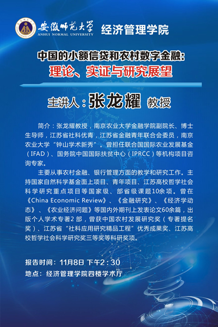 学术讲座预告:中国的小额信贷和农村数字金融:理论、实证与研究展望