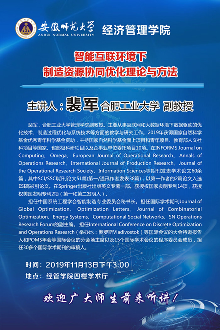 【学术讲座预告】智能互联环境下制造资源协同优化理论与方法