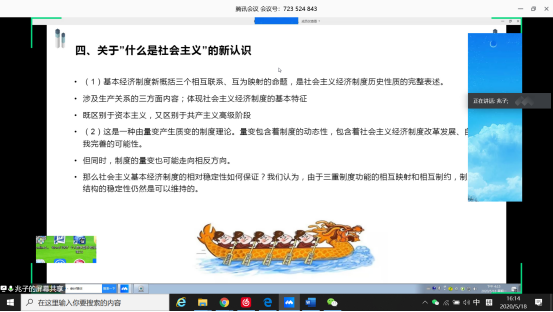 会议最后,蔡敏老师总结本次讲座的中心内容,并感谢荣教授在此疫情期间给全体师生开展的这场精彩的学术讲座,本次学术讲座涉及面广,有关于社会主义基本经济制度新概括的讨论,也有其他关于政治经济学前沿理论的探讨,与会人员纷纷表示受益匪浅。