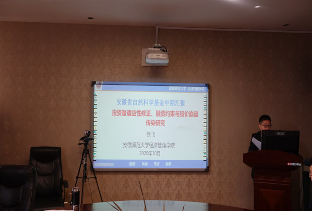 首先,徐飞博士就自己主持的2019年度安徽省自然基金《投资者适应性修正、融资约束与股价崩盘传染研究》课题,从项目研究进展、论文成果、课题成果、员工培养、进行中成果及下一步的计划和存在的问题等方面进行了认真的PPT汇报。