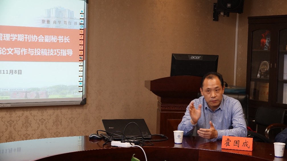 霍国成主任作了题为“高水平论文写作与投稿技巧指导”的学术汇报。霍国成主任首先介绍了经济学、管理学期刊的特点,结合自身工作经历从初审、外审、复审、终审等环节介绍了论文撰写和投稿的注意事项,作者应该了解收录期刊和投稿要点,明确写作的外部驱动因素和内部驱动因素。最后,详细讲解了一些在投稿过程中需要注意的事项,以及反对学术造假,谨防投稿陷阱等问题。