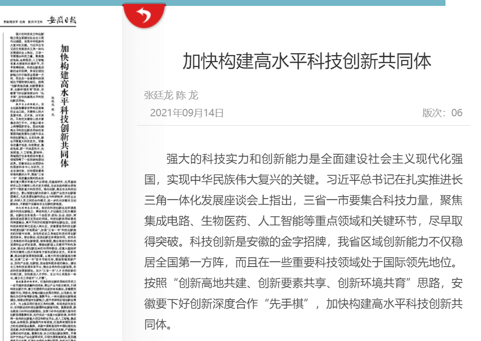 本网讯(m88官网 吴春玲)m88官方网站登录地址长三角一体化发展研究院研究员张廷龙、陈龙合作的理论文章《加快构建高水平科技创新共同体》被《安徽日报》9月14日的理论版刊发。