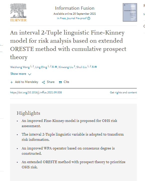 汪伟忠博士团队发表的《An interval 2-Tuple linguistic Fine-Kinney model for risk analysis based on extended ORESTE method with cumulative prospect theory》文章,提出了复杂不确定情境下考虑决策者偏好和风险关联情形的职业健康风险优先性识别方法。汪伟忠博士为第一作者,丁玲博士和刘树利博士为共同通讯作者。《Information Fusion》影响因子12.95,SCI一区,中科院一区,TOP期刊。