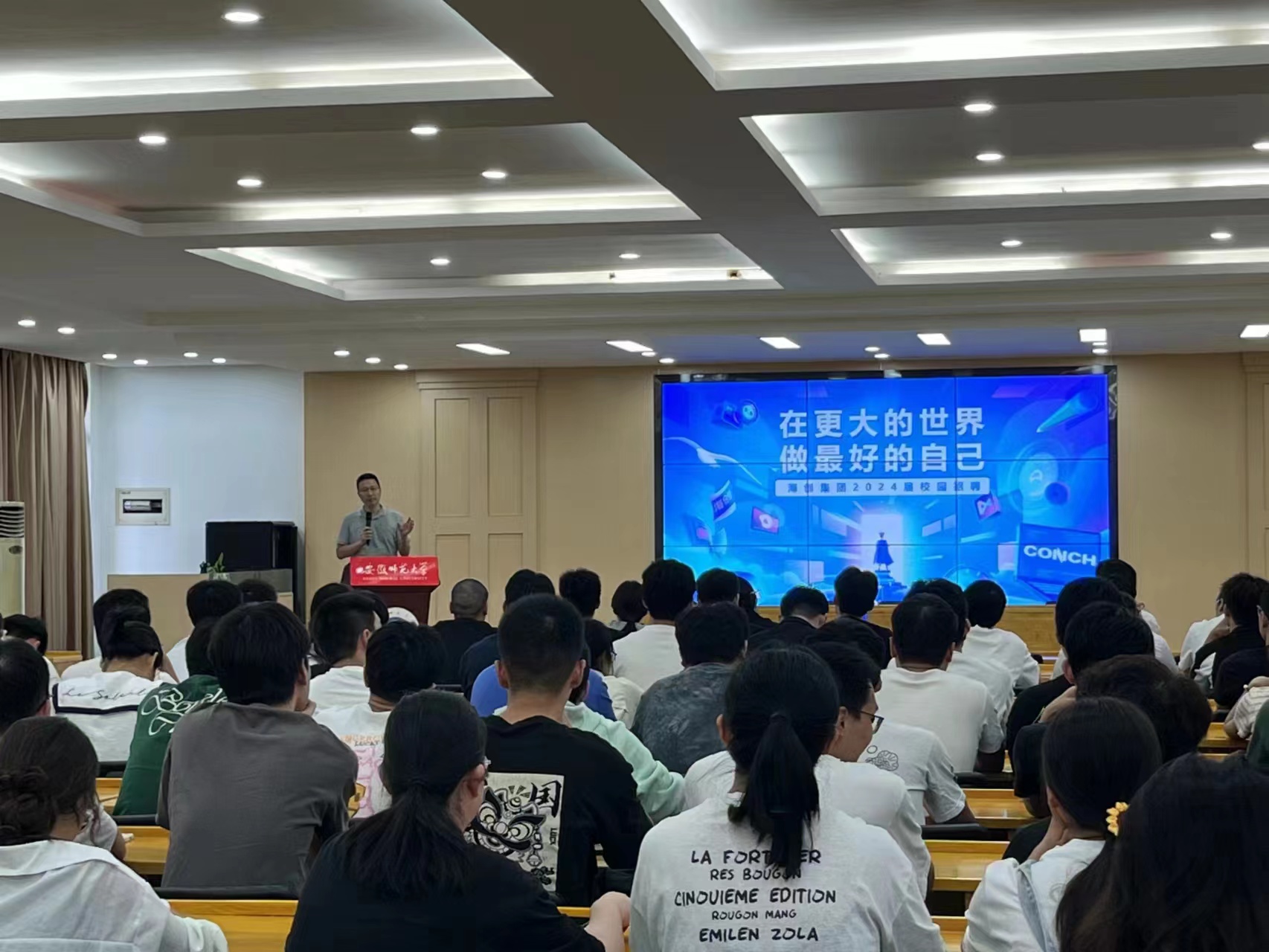 会议伊始,公司党委副书记陈刚锋向与会同学分析了秋招的形势和重要性,并指出9、10月份会后续有大量企业来校招聘,希望同学们能重视每一次的招聘会机会,他鼓励同学们要积极主动,尽早落实自己的就业去向。随后,海创集团负责人吴杨对公司进行了介绍。他表示,海创集团是为安徽海螺集团改制而依法设立的,经营产业涉及贸易物流、高端制造、医疗服务、金融投资等多个领域,公司始终坚持“以事业吸引人、以目标凝聚人、以机制激励人”的用人理念。接着,他对企业的发展模式、业务板块、人才培养、多元服务等方面进行了具体的阐述,展现了海创集团的企业实力以及未来的无限潜力。随后,吴杨详细地说明了招聘岗位及要求。他指出,企业为员工提供了非常优厚的福利待遇,包括五险一金、健康体侧、年终奖励等,引发了同学们极大的热情。宣讲会上,他还着重介绍了芜湖紫云英人才计划,它是芜湖专门为毕业生推出的一项就业政策。最后,他一一解答了同学们的问题,说明了本次招聘的应聘流程,组织简历的现场投递和初面。