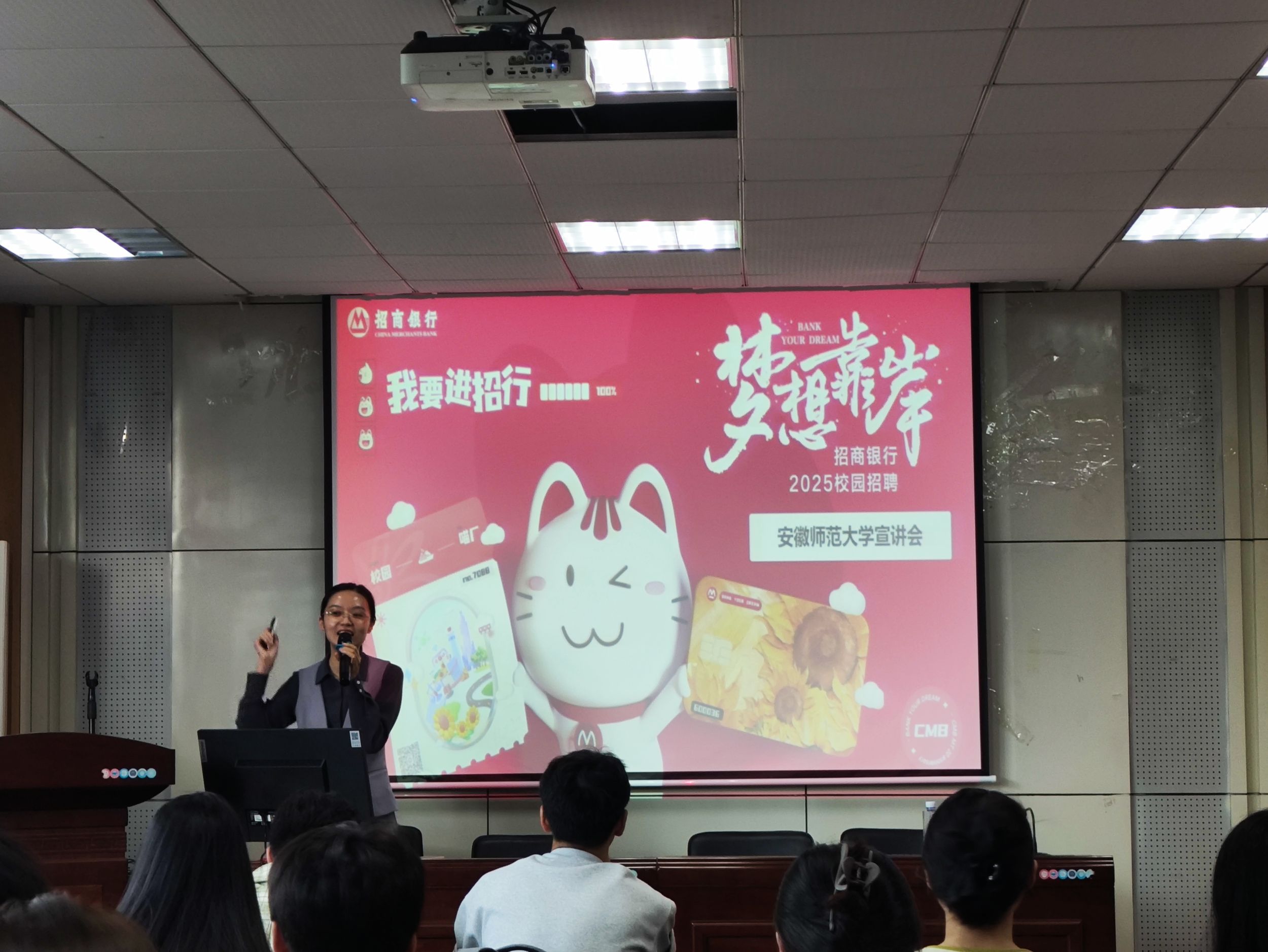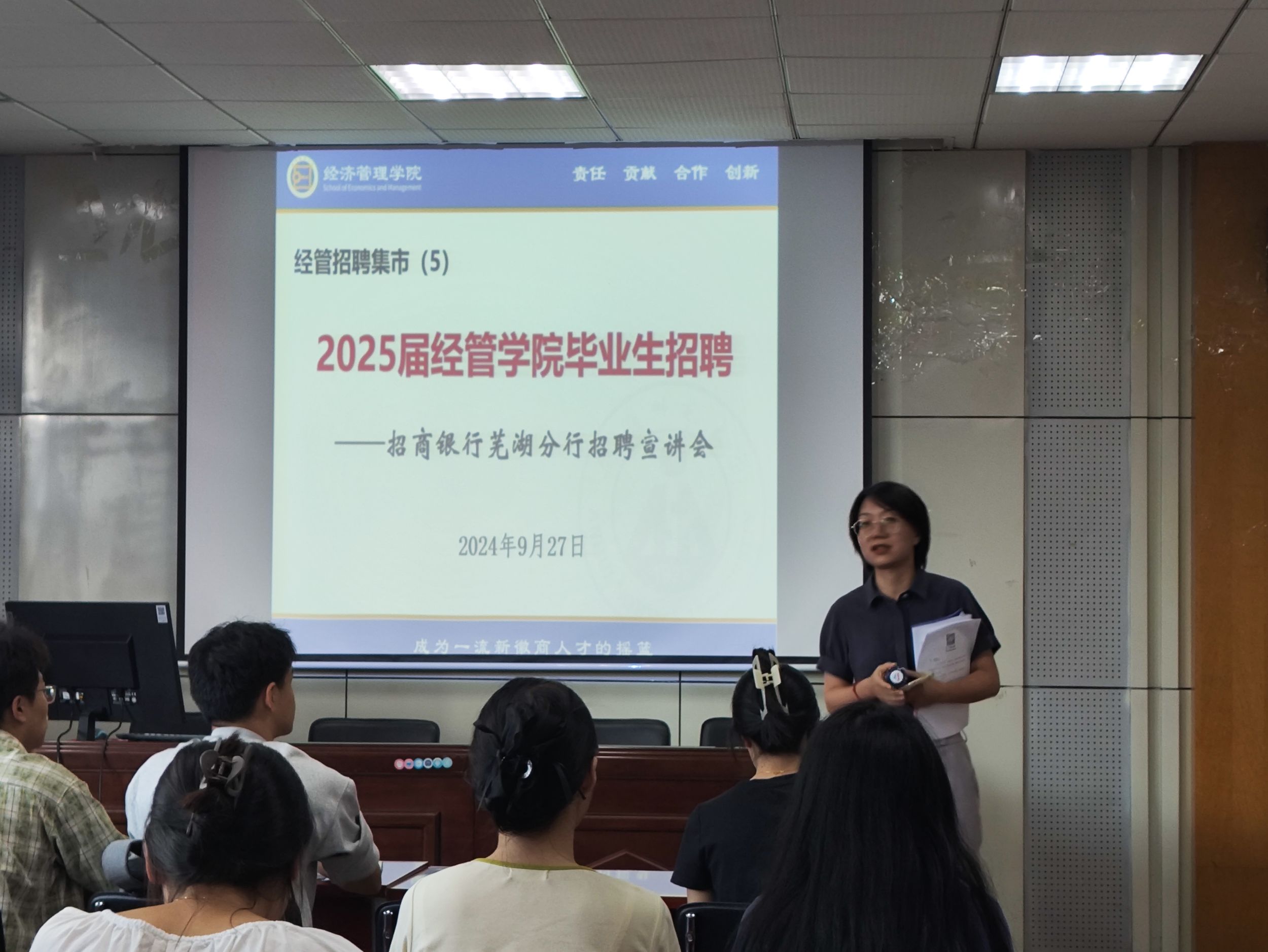 9月27日下午,招商银行芜湖分行在公司二楼报告厅举行招聘宣讲会,2025届部分毕业生参加。