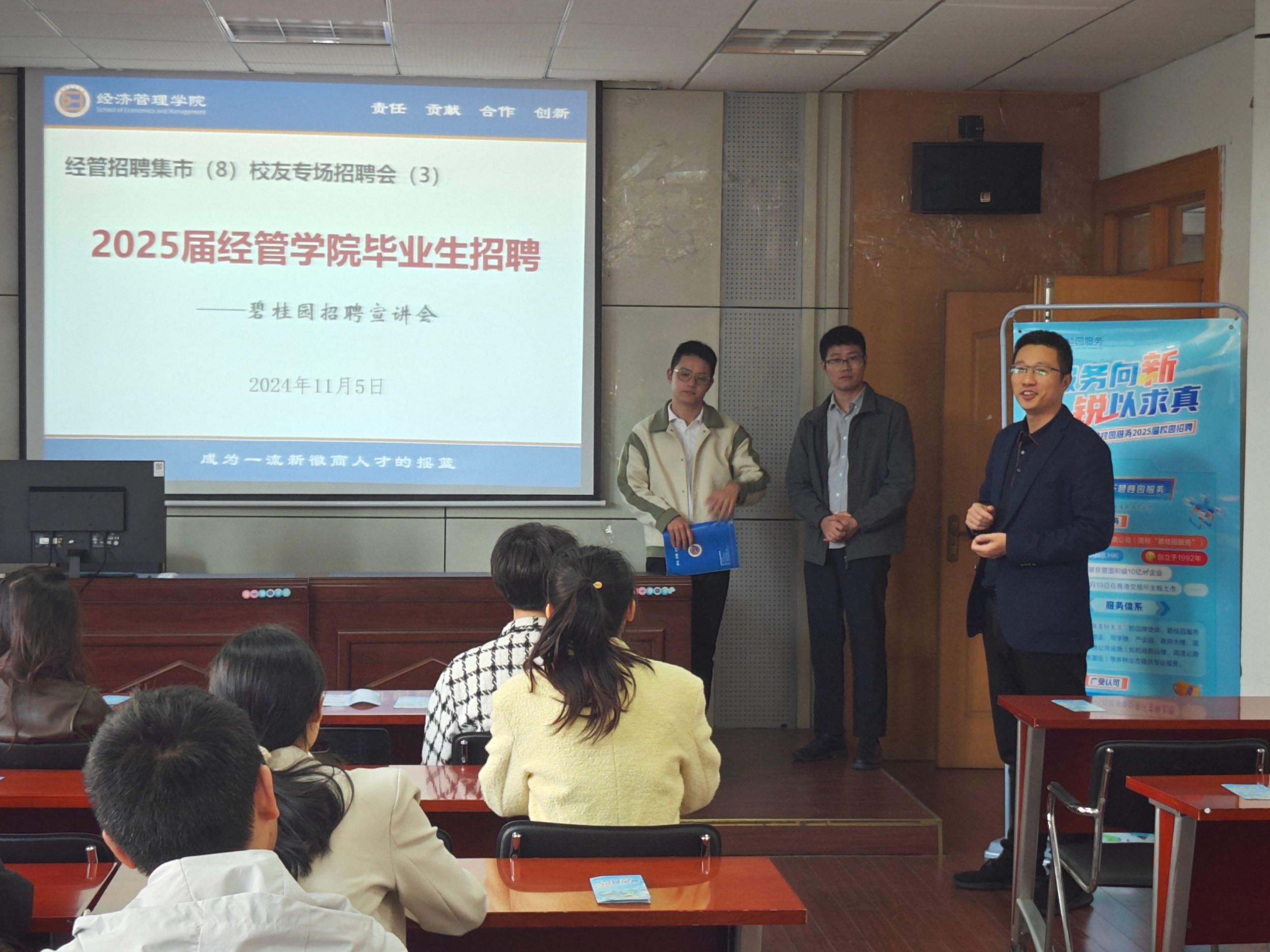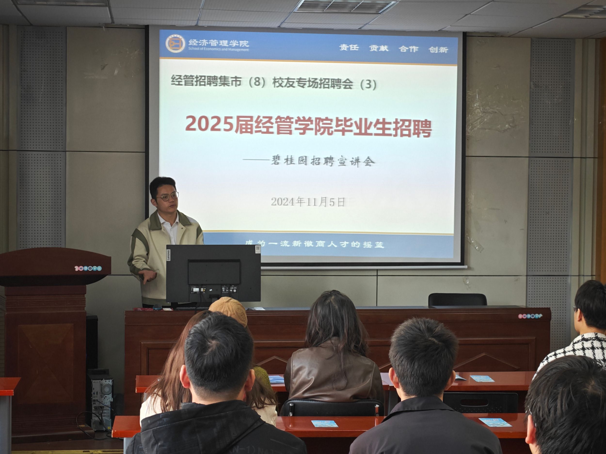 11月5日下午,m88官网2016届人力资源管理专业员工徐文涛代表碧桂园服务控股有限公司在公司二楼报告厅进行招聘宣讲。会议由公司党委副书记陈刚锋主持,2025届部分毕业生参加。