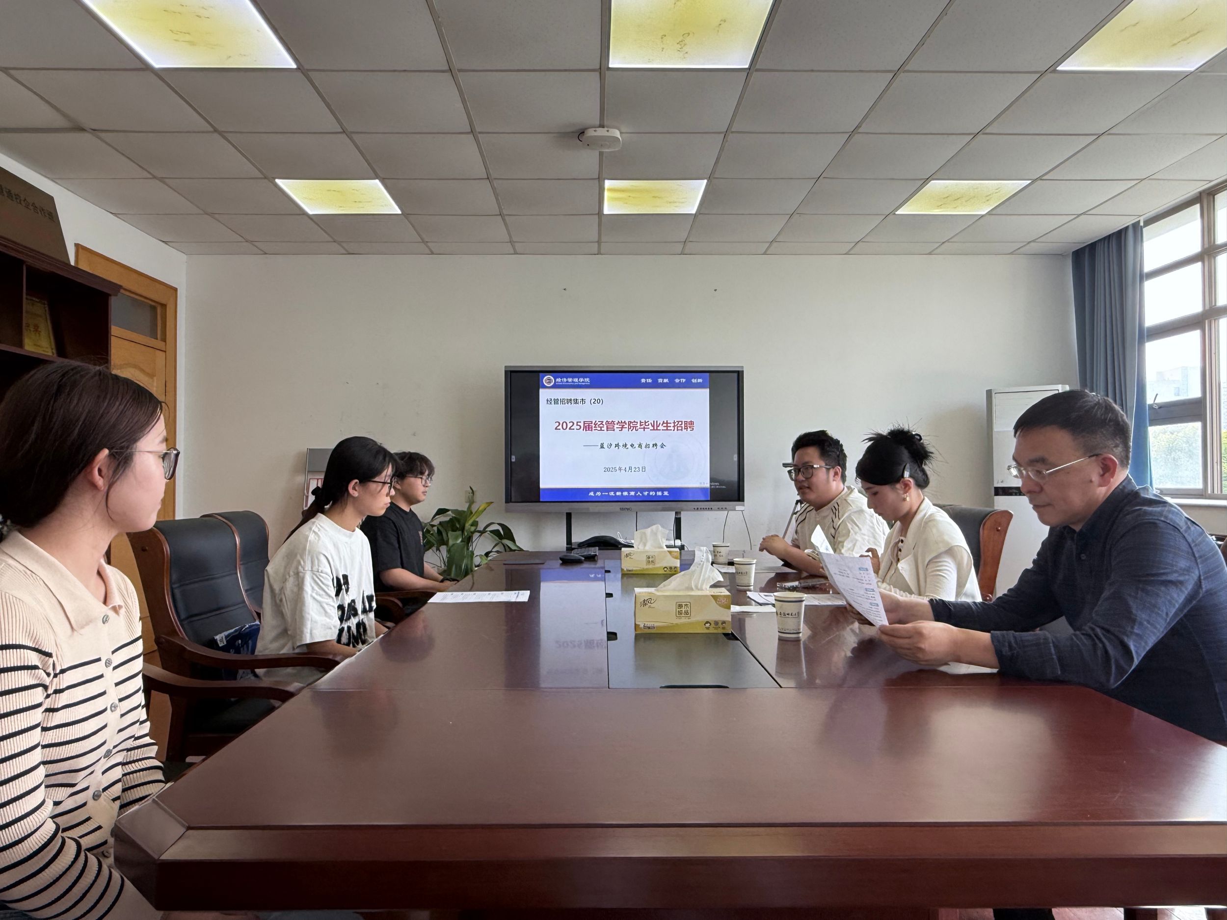 4月23日下午,蓝汐跨境电商在经管公司四楼会议室进行招聘宣讲。部分2025届毕业生到场参加。