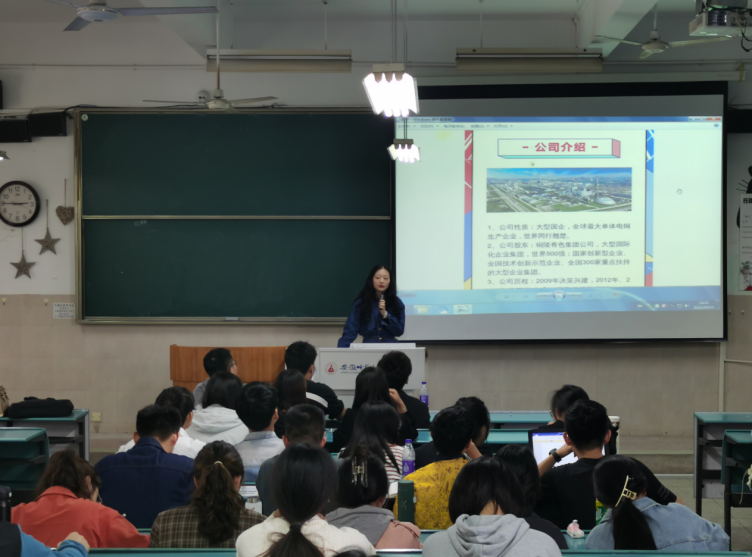 宣讲会伊始,刘萍通过一段视频影像向大家介绍了铜陵有色金冠铜业的发展状况、企业文化以及现有成就,让同学们对铜陵有色有了初步了解。她表示,企业致力于通过举办文体活动丰富员工生活,营造积极向上的企业文化氛围,搭建各部门之间相互交流沟通的平台,推动企业的和谐发展。接着,她围绕同学们较为关注的员工待遇问题,向同学们着重介绍了公司的职业发展路径和薪酬福利待遇。她表示公司拥有管理类、技术类、技能类等多个方向的职业通道,建立了多通道晋升机制。同时企业会对员工开展针对性的工作指导和教育培训,通过稳定的薪酬分配体系和系统的员工教育培训使员工获得稳定持续的职业发展机会。会议最后,她向同学们发出诚挚邀请,并一一解答了同学们的疑问,有意愿的同学也积极向其投递了简历。