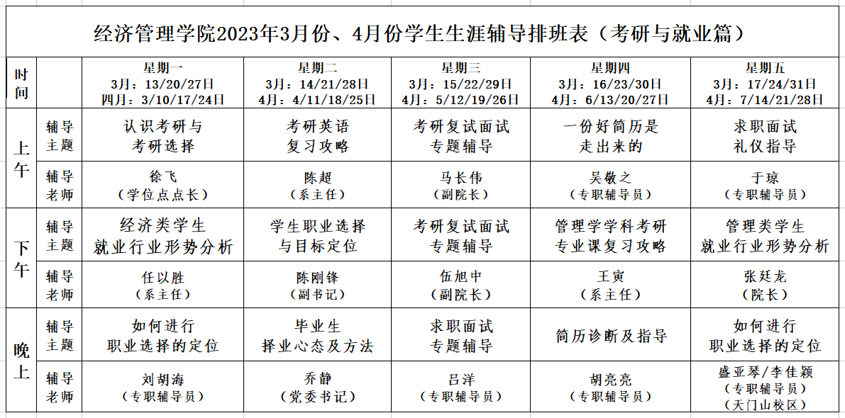 各位同学,为了做好大家在升学、求职过程中的答疑解惑工作,公司本学期继续开启员工生涯咨询辅导工作。现将3、4月份咨询辅导主题和辅导老师信息告知如下。若您在考研、就业过程中,有相关方面的问题,抓紧来预约咨询吧!