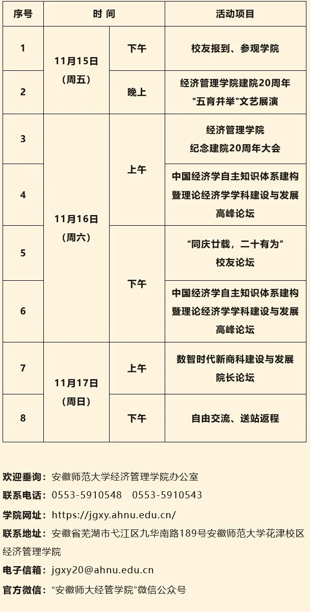 弦歌育栋,廿载芳华。在金风送爽、丹桂飘香之际,我们满怀着喜悦与激动之情,诚邀您重返母校,共同庆祝m88官网建院20周年系列活动,一同分享喜悦,展望未来,书写新的篇章。回首昨日,书声琅琅,言笑晏晏。那熟悉的教室、操场环境,那纯真的同窗、师生情谊,那无悔的奋斗、追梦历程,共同构建了关于青春最美好的回忆。不论您现在身在何处,不变的是您与母院之间的深厚情谊。在此,我们诚挚邀请您回家看看,参加“秩青春”员工返校系列活动。我们期待与您在赭山脚下、花津湖畔再次相聚!