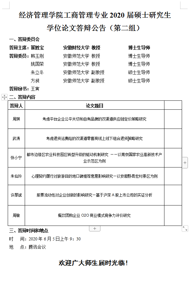 m88官网2020届硕士研究生学位论文答辩公告-工商管理