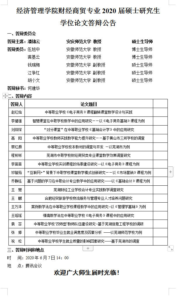 m88官网2020届硕士研究生学位论文答辩公告---财经商贸