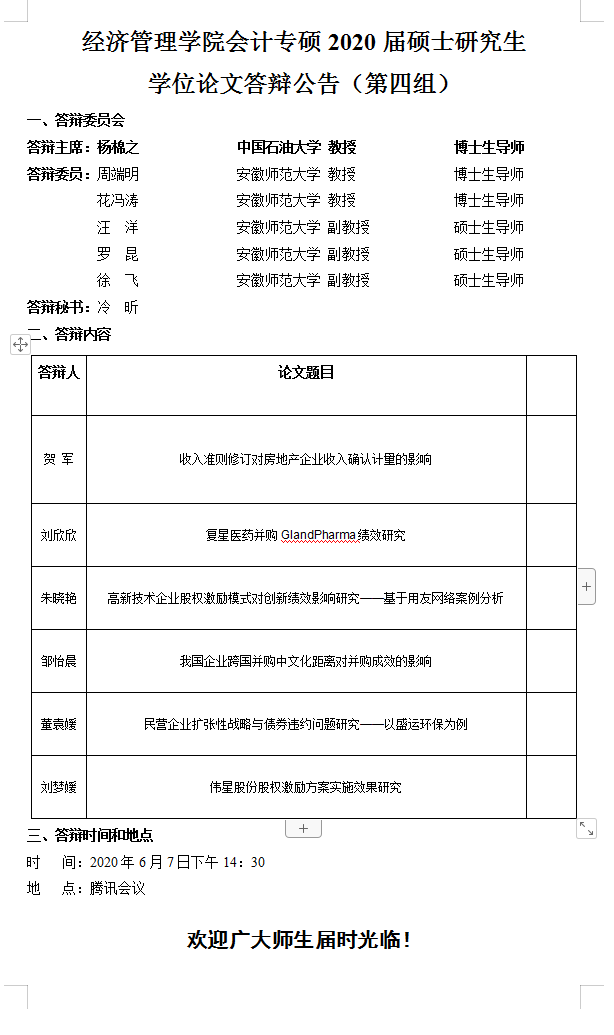 m88官网2020届硕士研究生学位论文答辩公告---会计专硕