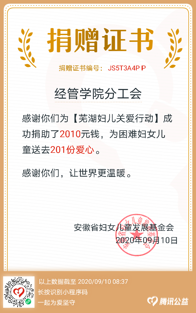经管院分工会讯由m88官方网站登录地址校工会联合校团委参加“芜湖妇儿关爱行动”公益募捐活动已于日前结束。公司分工会积极参加了此项活动,全院教师员工踊跃参加,共募捐2010元,为困难妇女儿童送去201份爱心。