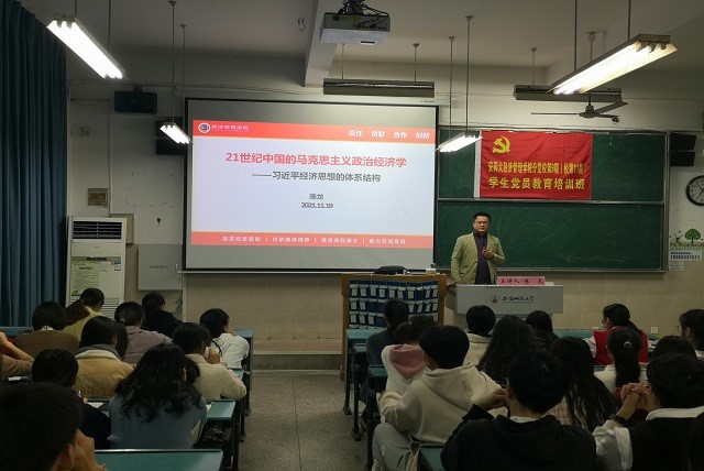 本网讯(m88官网 盛亚琴 盛燕)为进一步加深经管学子对习近平经济思想的理解,11月19日晚19:00,m88官网陈龙应邀在行知楼2020104教室开展关于《21世纪中国的马克思主义政治经济学——习近平经济思想的体系结构》专题辅导报告,m88官网分党校第9期员工党员教育培训班全体成员共同参与学习。