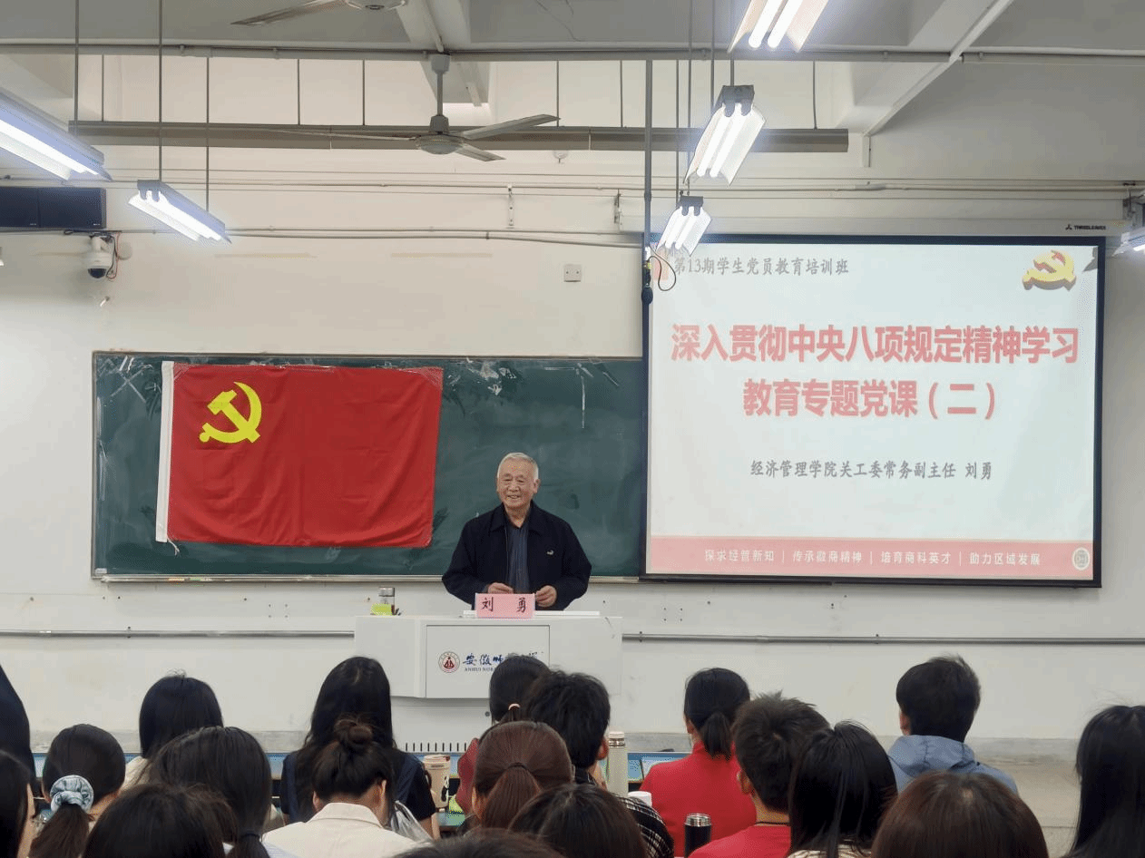 本次报告以“筑牢思想根基,永葆党员本色”为主题,重点聚焦新时代全面从严治党要求。刘勇结合党史发展脉络,系统回顾了中央八项规定精神的历史渊源与现实意义,从井冈山时期"三大纪律八项注意"的历史实践,到七届二中全会"两个务必"的赶考精神,深入阐释中国共产党始终将作风建设作为立党之本的政治传统。刘勇重点解读了党的十八大以来中央八项规定精神的深化发展,深入剖析形式主义、官僚主义的新表现,结合高校典型案例,警示青年党员要严守纪律红线。他强调,青年党员要筑牢理想信念、戒除功利思想,要弘扬务实作风、戒除浮躁心态,要密切联系群众、戒除官僚做派,坚持做优良传统的传承者、新风正气的践行者。