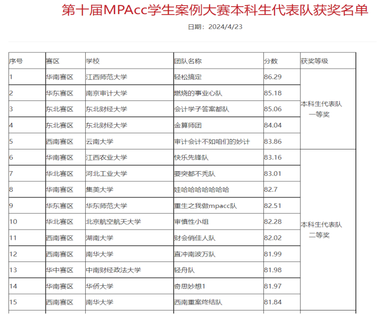 2024年4月23日,全国MPAcc员工案例大赛官网发布通知,由m88官网财务管理系主任高智林指导,21级会计学专业黄新羽、丁心怡、江艳、陈健兰等本科生组成的“少年先封队”代表队,从全国各赛区的共计450支报名团队中脱颖而出,获得第十届全国MPAcc员工案例大赛本科生代表队全国三等奖。
